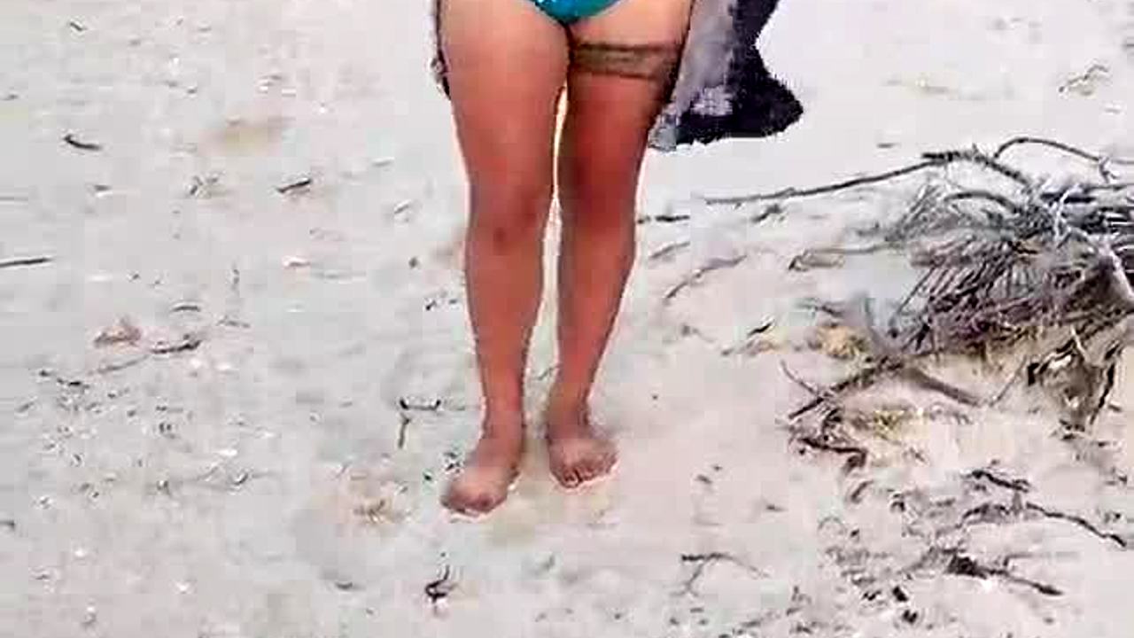look at this beautiful stepmother touching her ass on the beach in bikini, curvy and hairy.
